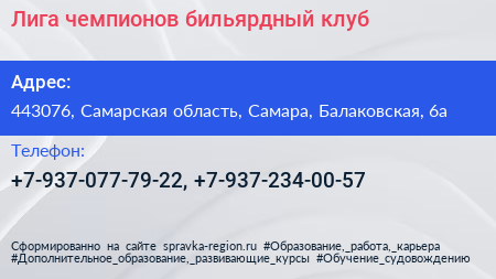 Лига чемпионов, бильярдный клуб по адресу 443076, Самарская область, Самара, Балаковская, 6а в дальнейшем Организация, размещена в следующих категориях: