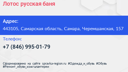Лотос, русская баня по адресу 443105, Самарская область, Самара, Черемшанская, 157 в дальнейшем Организация, размещена в следующих категориях: