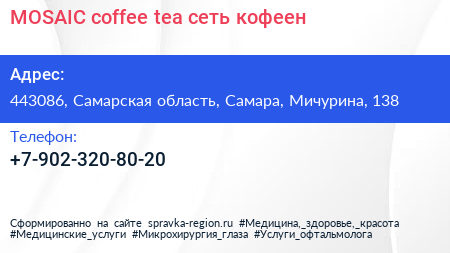 MOSAIC coffee & tea, сеть кофеен по адресу 443086, Самарская область, Самара, Мичурина, 138 в дальнейшем Организация, размещена в следующих категориях: