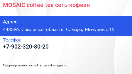 MOSAIC coffee & tea, сеть кофеен по адресу 443096, Самарская область, Самара, Мичурина, 15 в дальнейшем Организация, размещена в следующих категориях: