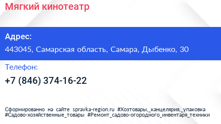 Мягкий кинотеатр по адресу 443045, Самарская область, Самара, Дыбенко, 30 в дальнейшем Организация, размещена в следующих категориях: