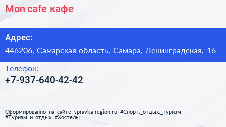 Mon cafe, кафе по адресу 446206, Самарская область, Самара, Ленинградская, 16 в дальнейшем Организация, размещена в следующих категориях: