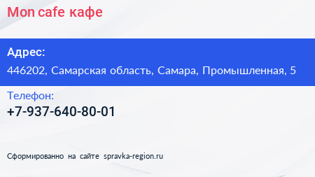 Mon cafe, кафе по адресу 446202, Самарская область, Самара, Промышленная, 5 в дальнейшем Организация, размещена в следующих категориях: