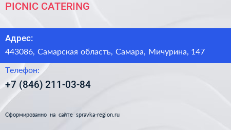 PICNIC CATERING по адресу 443086, Самарская область, Самара, Мичурина, 147 в дальнейшем Организация, размещена в следующих категориях: