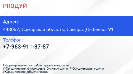 PROДУЙ по адресу 443067, Самарская область, Самара, Дыбенко, 91 в дальнейшем Организация, размещена в следующих категориях: