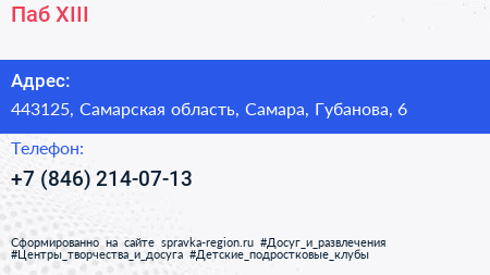 Паб XIII по адресу 443125, Самарская область, Самара, Губанова, 6 в дальнейшем Организация, размещена в следующих категориях: