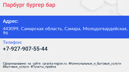Парбург, бургер-бар по адресу 443099, Самарская область, Самара, Молодогвардейская, 96 в дальнейшем Организация, размещена в следующих категориях:
