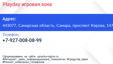 Playday, игровая зона по адресу 443077, Самарская область, Самара, проспект Кирова, 147 в дальнейшем Организация, размещена в следующих категориях: