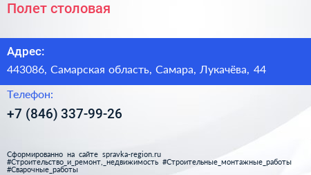 Полет, столовая по адресу 443086, Самарская область, Самара, Лукачёва, 44 в дальнейшем Организация, размещена в следующих категориях: