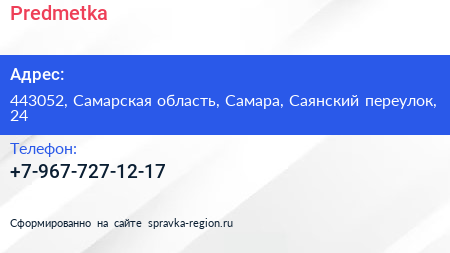 Predmetka по адресу 443052, Самарская область, Самара, Саянский переулок, 24 в дальнейшем Организация, размещена в следующих категориях: