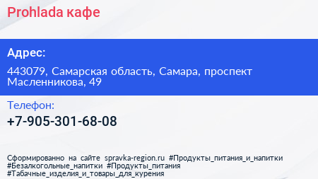Prohlada, кафе по адресу 443079, Самарская область, Самара, проспект Масленникова, 49 в дальнейшем Организация, размещена в следующих категориях:
