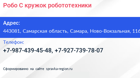 Робо-С, кружок робототехники по адресу 443081, Самарская область, Самара, Ново-Вокзальная, 116 в дальнейшем Организация, размещена в следующих категориях: