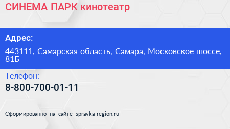 СИНЕМА ПАРК, кинотеатр по адресу 443111, Самарская область, Самара, Московское шоссе, 81Б в дальнейшем Организация, размещена в следующих категориях: