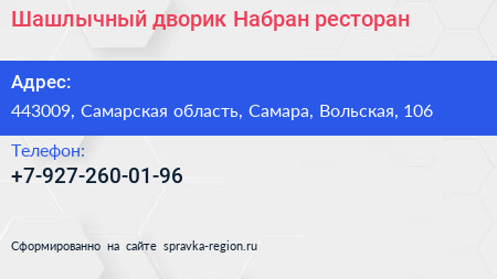 Шашлычный дворик Набран, ресторан по адресу 443009, Самарская область, Самара, Вольская, 106 в дальнейшем Организация, размещена в следующих категориях:
