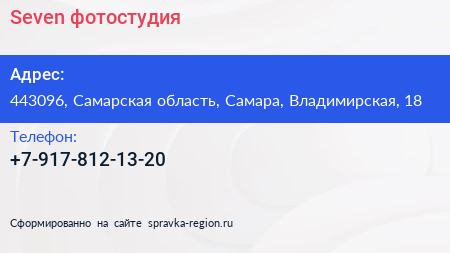 Seven, фотостудия по адресу 443096, Самарская область, Самара, Владимирская, 18 в дальнейшем Организация, размещена в следующих категориях:
