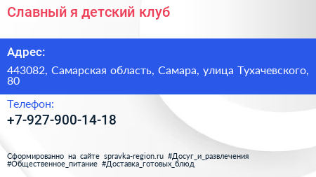 Славный я, детский клуб по адресу 443082, Самарская область, Самара, улица Тухачевского, 80 в дальнейшем Организация, размещена в следующих категориях: