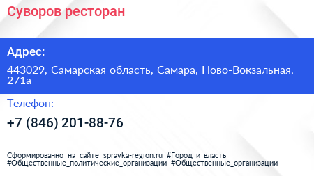 Суворов, ресторан по адресу 443029, Самарская область, Самара, Ново-Вокзальная, 271а в дальнейшем Организация, размещена в следующих категориях: