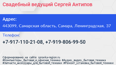Свадебный ведущий Сергей Антипов по адресу 443099, Самарская область, Самара, Ленинградская, 37 в дальнейшем Организация, размещена в следующих категориях: