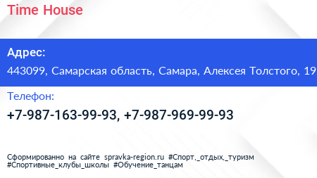Time House по адресу 443099, Самарская область, Самара, Алексея Толстого, 19 в дальнейшем Организация, размещена в следующих категориях: