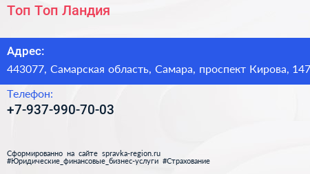Топ-Топ Ландия по адресу 443077, Самарская область, Самара, проспект Кирова, 147 в дальнейшем Организация, размещена в следующих категориях: