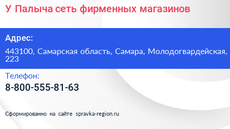 У Палыча, сеть фирменных магазинов по адресу 443100, Самарская область, Самара, Молодогвардейская, 223 в дальнейшем Организация, размещена в следующих категориях: