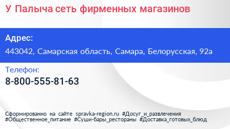 У Палыча, сеть фирменных магазинов по адресу 443042, Самарская область, Самара, Белорусская, 92а в дальнейшем Организация, размещена в следующих категориях: