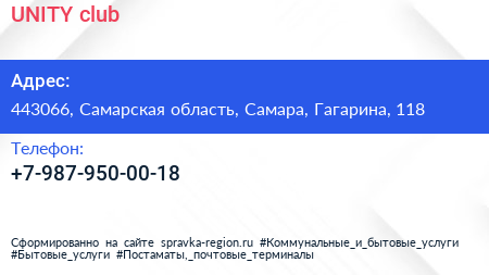 UNITY club по адресу 443066, Самарская область, Самара, Гагарина, 118 в дальнейшем Организация, размещена в следующих категориях: