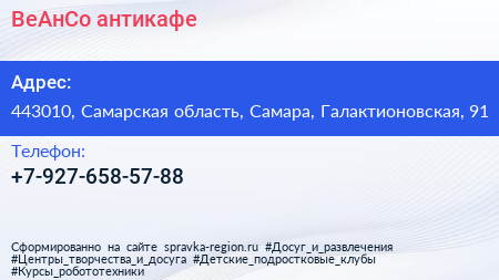 ВеАнСо, антикафе по адресу 443010, Самарская область, Самара, Галактионовская, 91 в дальнейшем Организация, размещена в следующих категориях:
