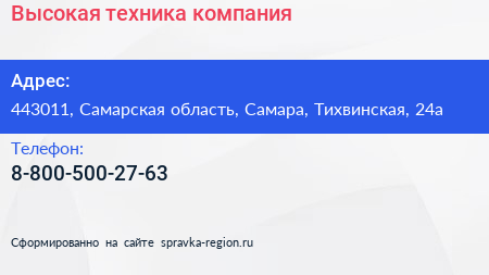 Высокая техника, компания по адресу 443011, Самарская область, Самара, Тихвинская, 24а в дальнейшем Организация, размещена в следующих категориях: