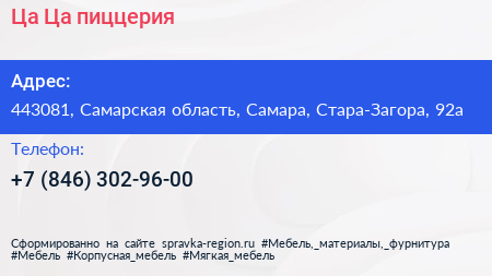 Ца-Ца, пиццерия по адресу 443081, Самарская область, Самара, Стара-Загора, 92а в дальнейшем Организация, размещена в следующих категориях: