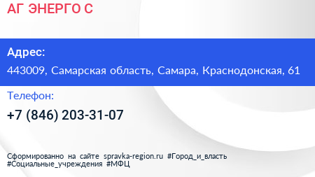 АГ ЭНЕРГО-С по адресу 443009, Самарская область, Самара, Краснодонская, 61 в дальнейшем Организация, размещена в следующих категориях: