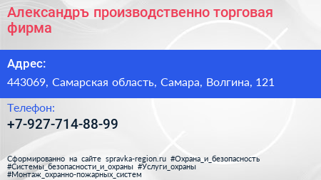 Александръ, производственно-торговая фирма по адресу 443069, Самарская область, Самара, Волгина, 121 в дальнейшем Организация, размещена в следующих категориях: