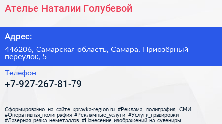 Ателье Наталии Голубевой по адресу 446206, Самарская область, Самара, Приозёрный переулок, 5 в дальнейшем Организация, размещена в следующих категориях: