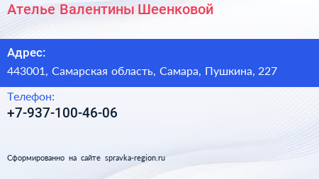 Ателье Валентины Шеенковой по адресу 443001, Самарская область, Самара, Пушкина, 227 в дальнейшем Организация, размещена в следующих категориях:
