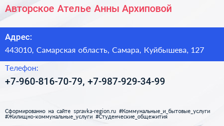 Авторское Ателье Анны Архиповой по адресу 443010, Самарская область, Самара, Куйбышева, 127 в дальнейшем Организация, размещена в следующих категориях: