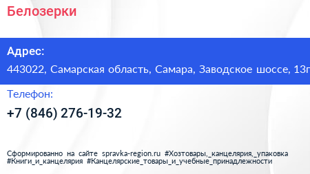Белозерки по адресу 443022, Самарская область, Самара, Заводское шоссе, 13г в дальнейшем Организация, размещена в следующих категориях: