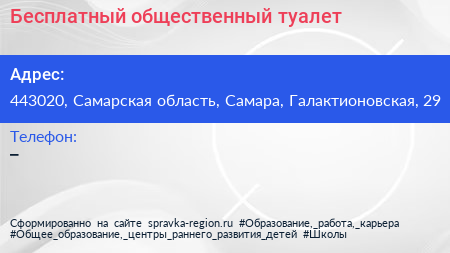 Бесплатный общественный туалет по адресу 443020, Самарская область, Самара, Галактионовская, 29 в дальнейшем Организация, размещена в следующих категориях: