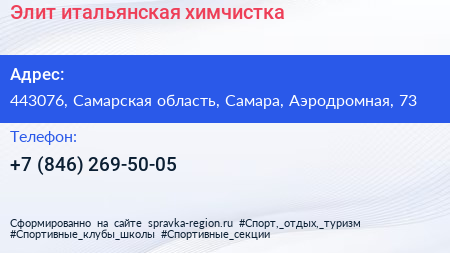 Элит, итальянская химчистка по адресу 443076, Самарская область, Самара, Аэродромная, 73 в дальнейшем Организация, размещена в следующих категориях: