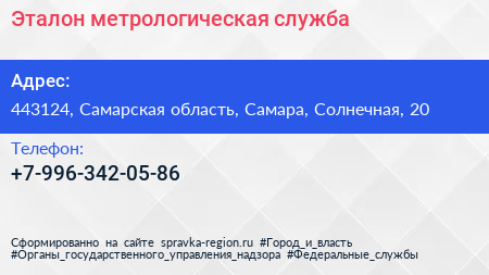 Эталон, метрологическая служба по адресу 443124, Самарская область, Самара, Солнечная, 20 в дальнейшем Организация, размещена в следующих категориях: