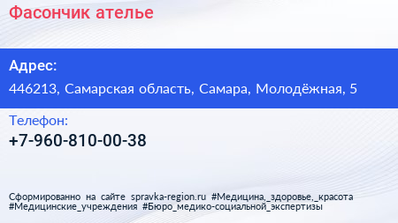 Фасончик, ателье по адресу 446213, Самарская область, Самара, Молодёжная, 5 в дальнейшем Организация, размещена в следующих категориях: