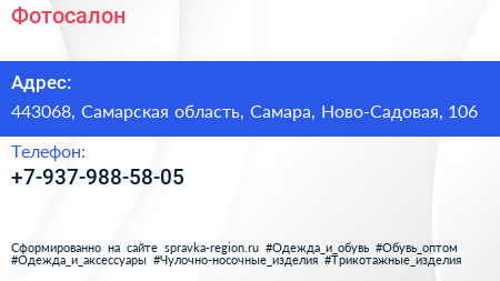Фотосалон по адресу 443068, Самарская область, Самара, Ново-Садовая, 106 в дальнейшем Организация, размещена в следующих категориях: