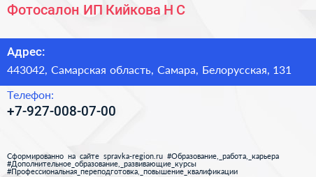 Фотосалон, ИП Кийкова Н.С. по адресу 443042, Самарская область, Самара, Белорусская, 131 в дальнейшем Организация, размещена в следующих категориях: