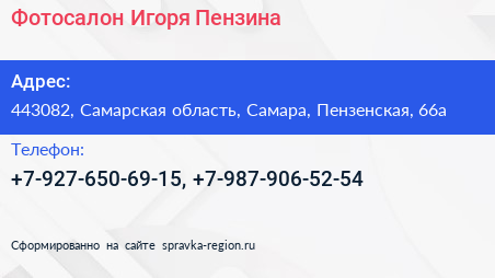 Фотосалон Игоря Пензина по адресу 443082, Самарская область, Самара, Пензенская, 66а в дальнейшем Организация, размещена в следующих категориях:
