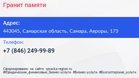Гранит памяти по адресу 443045, Самарская область, Самара, Авроры, 173 в дальнейшем Организация, размещена в следующих категориях: