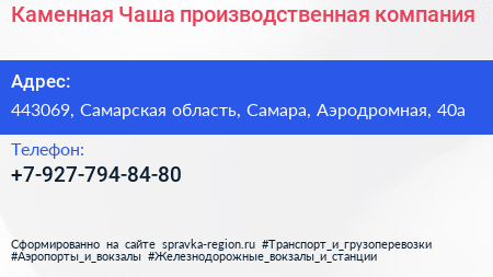 Каменная Чаша, производственная компания по адресу 443069, Самарская область, Самара, Аэродромная, 40а в дальнейшем Организация, размещена в следующих категориях: