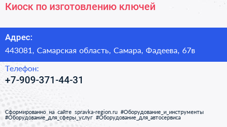 Киоск по изготовлению ключей по адресу 443081, Самарская область, Самара, Фадеева, 67в в дальнейшем Организация, размещена в следующих категориях: