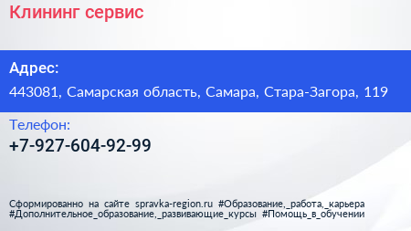 Клининг-сервис по адресу 443081, Самарская область, Самара, Стара-Загора, 119 в дальнейшем Организация, размещена в следующих категориях:
