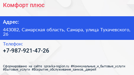 Комфорт плюс по адресу 443082, Самарская область, Самара, улица Тухачевского, 26 в дальнейшем Организация, размещена в следующих категориях: