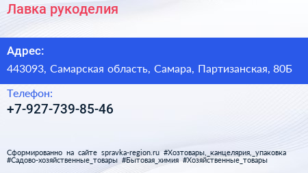Лавка рукоделия по адресу 443093, Самарская область, Самара, Партизанская, 80Б в дальнейшем Организация, размещена в следующих категориях: