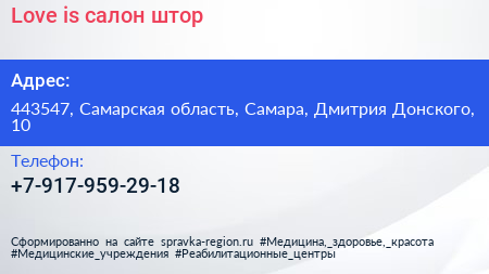Love is, салон штор по адресу 443547, Самарская область, Самара, Дмитрия Донского, 10 в дальнейшем Организация, размещена в следующих категориях: